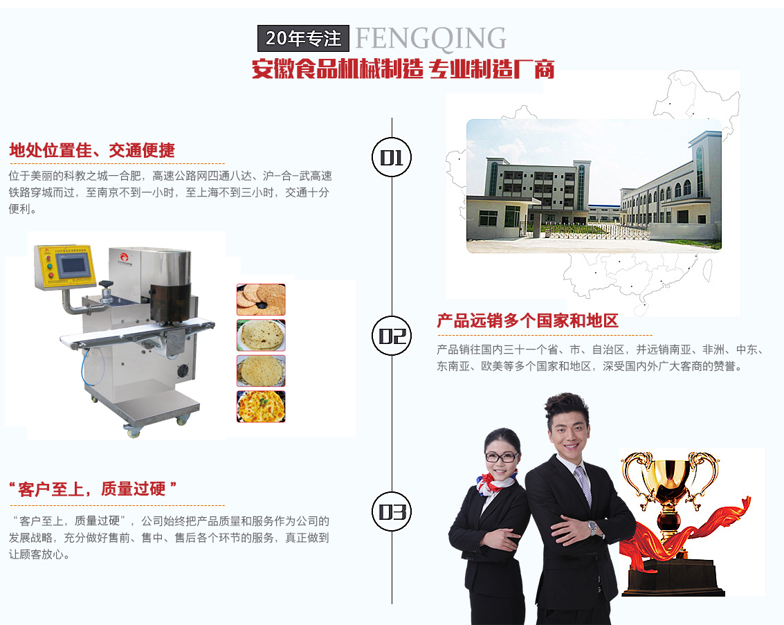 安徽豐慶食品機械制造有限公司位于美麗的科教之城—合肥,高速公路網四通八達、滬-合-武高速鐵路穿城而過,至南京不到一小時,至上海不到三小時,交通十分便利。 安徽豐慶食品機械制造有限公司是一家以面點、糕點、餅類等烘焙類食品機械的研發、生產、銷售為一體的現代化企業,產品集智能化,機電氣一體化為一身。公司匯聚一批具有豐富行業經驗的專業人才,高端項目與中國科學技術大學攜手合作,憑借先進的經營理念和技術優勢,不斷提升企業的技術水準和加工檔次,增強了企業的市場競爭力和綜合實力。過硬的產品質量和完善的售后服務使產品銷往國內三十一個省、市、自治區,并遠銷南亞、非洲、中東、東南亞、歐美等多個國家和地區,深受國內外廣大客商的贊譽。 公司秉承“誠信、團隊、服務”的經營理念,為客戶源源不斷地提供高新技術產品及優良的服務是豐...公司環境展示